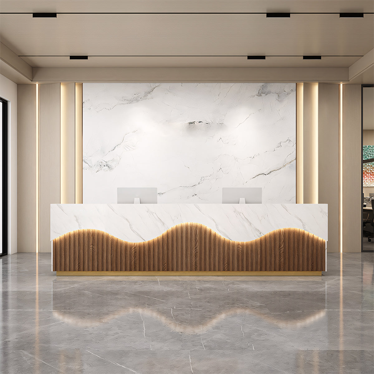 The reception desk is designed in the style of marble veneer, with a natural and elegant texture. There are a variety of styles to choose from, which is practical and beautiful, adding a different style.