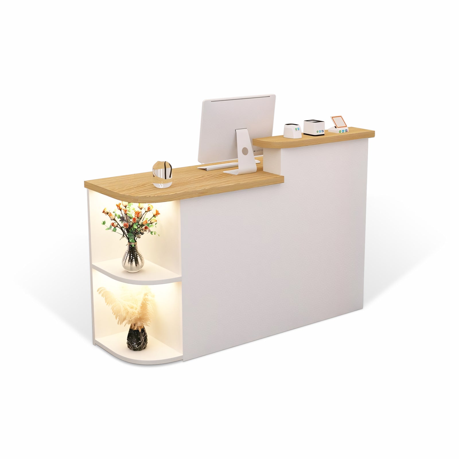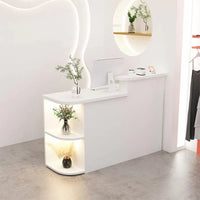 | This sleek white reception desk boasts a contemporary design, perfect for modern offices. It includes storage shelves for organized essentials and a spacious counter top. Combining functionality with style, it creates a welcoming reception area. Crafted from high-quality materials for durability, it's a practical addition to any workspace. |